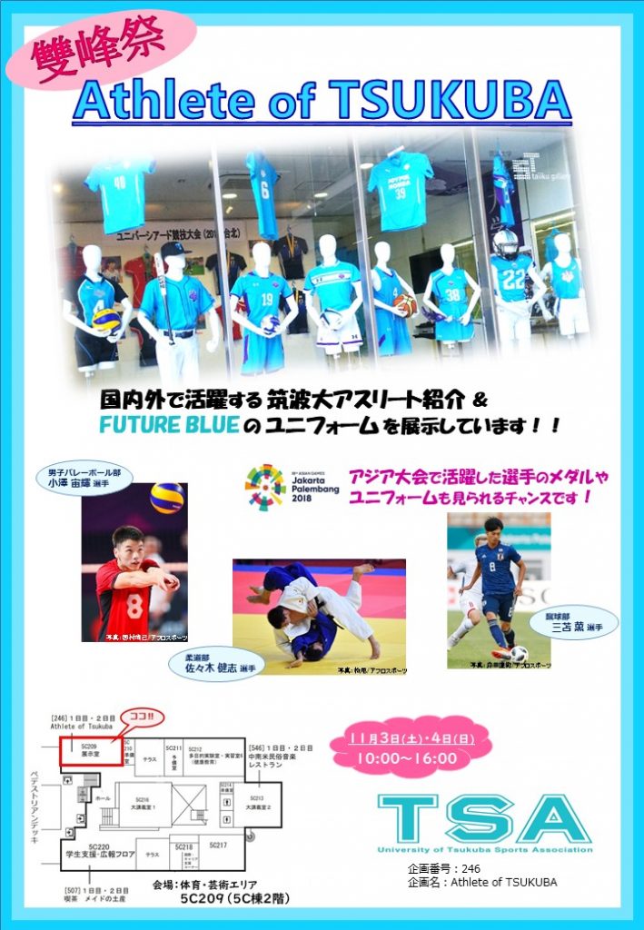 今年も、筑波大学学園祭「第44回雙峰祭」にて、TSAの展示企画『Athlete of TSUKUBA』を開催いたします。 筑波大生アスリートの活躍紹介を始め、「つくばブルー」のユニフォーム、箱根駅伝復活プロジェクト紹介などを展示いたします。更に、今夏のアジア大会で活躍した選手のメダルやユニフォームもご覧いただけます!皆さま、ぜひお越しください。