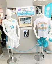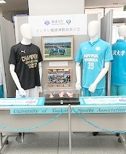 現在つくば市役所にて,本年度13年振り9回目のインカレ優勝を果たした蹴球部と,インカレ3連覇,今季トーナメント・リーグ戦・インカレの三冠を果たした男子バスケットボール部,同じくインカレ3連覇を果たした女子バトミントン部のユニフォームやメダルの展示を行っております。